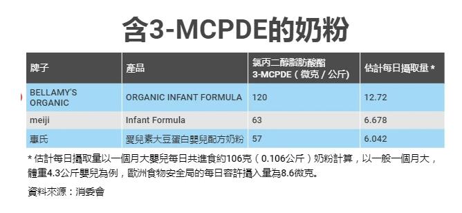 据悉,消委会近期检测了15款密封包装婴儿配方奶粉,发现全部样本均含有污染物氯丙二醇(3-MCPD),食用过量或损害肾功能或男性生殖能力。而当中含量最高的是“BELLAMY'S ORGANIC”,每公斤含有120微克3-MCPD,若按建议份量喂哺婴儿,会超出欧洲食物安全局的建议摄入限量。