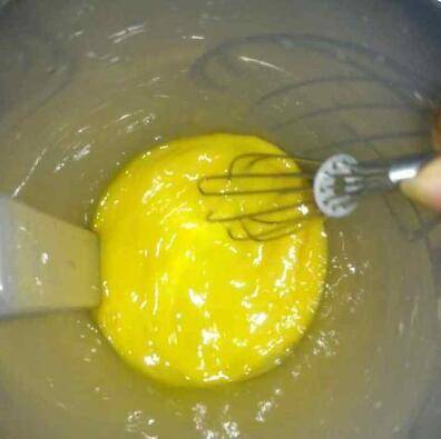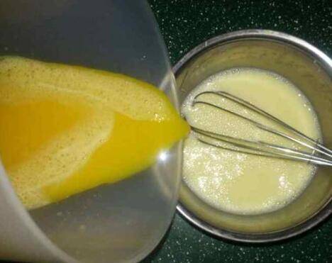 2、牛奶和白糖混合均匀,分5次加入打好的蛋液,每加一次,都在搅匀后,加下一次。
