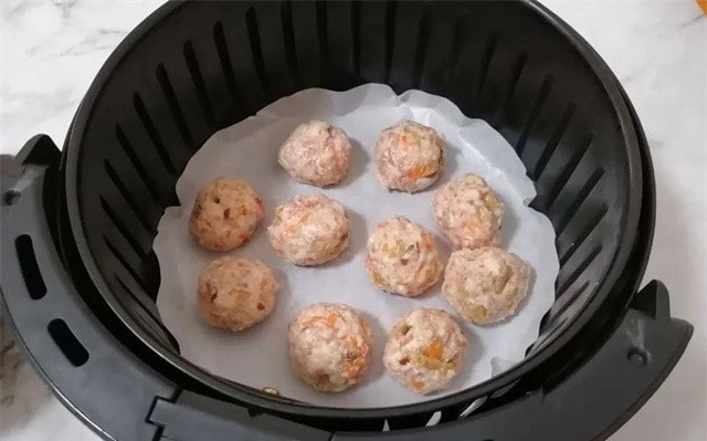 6、炸篮提前铺一层油纸,放入豆腐肉丸子。