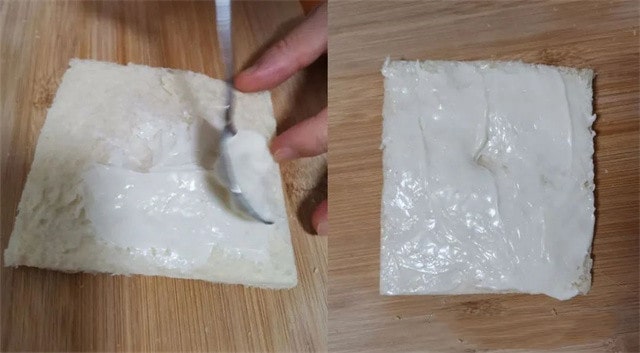 4、取一片切好的吐司涂上沙拉酱。