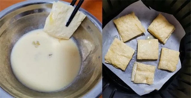 [各地小吃]空气炸锅食谱豆腐鸡蛋的做法 材料: 嫩豆腐1块、鸡蛋2个 做法步骤 1、碗中打两个鸡蛋,搅拌均匀。 2、豆腐切小块装盘,放入空气炸锅中,淋上蛋液,空气炸锅调180度烤10分钟。 3、调酱汁