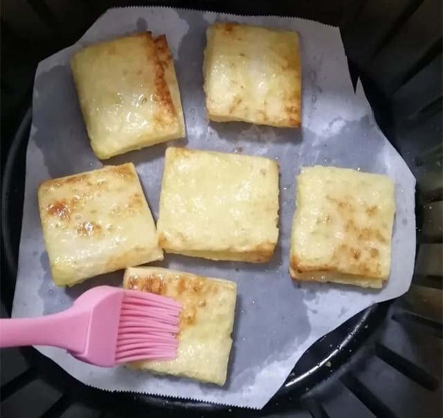 7、拉出炸篮,在吐司表面刷一层薄油,翻面,另一面也刷一层。