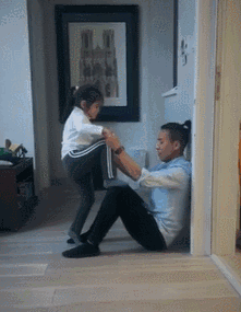 粑粑或麻麻先躺在地面上,让孩子推动你们的身体,此时请全身用力,阻止身体的滚动,然后鼓励孩子拼命推动你的身体。