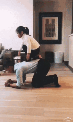 爸爸将双手与双脚跪膝撑在地上,做出四只跪膝撑地的姿势。让孩子爬上你的背,再让他跪变站在你的背部正中央。游戏时请注意安全。