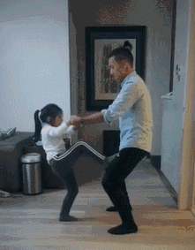家长背靠墙壁,膝盖弯曲。在握住孩子双手的状态下,让孩子的脚慢慢爬上你的膝盖,牢牢握住孩子双手,让孩子学习保持平衡不掉下去。在站稳的同时慢慢放开双手,让孩子自己展开双臂,提升平衡 。