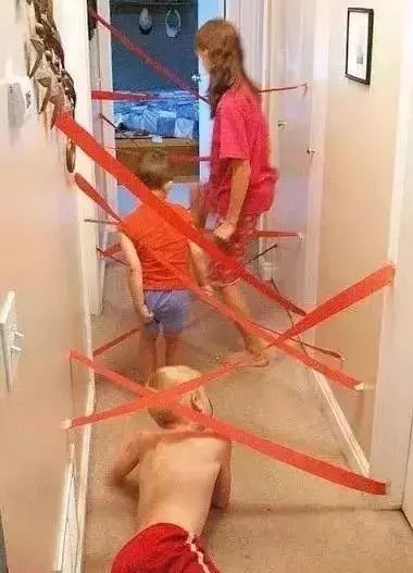 把胶带贴在墙上成为激光线,让孩子穿越不要碰到哦,是不是又紧张刺激的感觉。