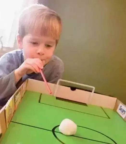 用纸板做个简易的球场,找一团棉花做球,然后爸爸或者妈妈和孩子一人一根吸管吹,看谁先把球吹到对方的球门里哦。