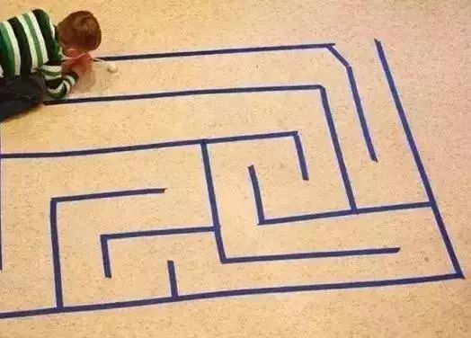 用胶带在地上贴出一个迷宫,让孩子用细杆推着小球走出迷宫,当中也可以设置一定的机关,障碍,请发挥爸爸妈妈的想象力哦。