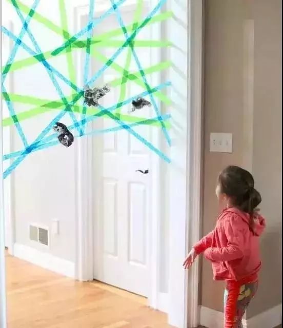 胶带在门上贴出不同的轨迹,让孩子用纸团扔过胶带,穿过去,不要被贴住咯。