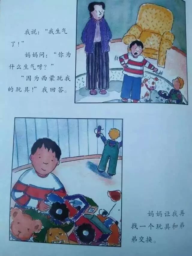我说:“我生气了!”妈妈问:“你为什么生气呀?”“因为西蒙玩我的玩具!”我回答。