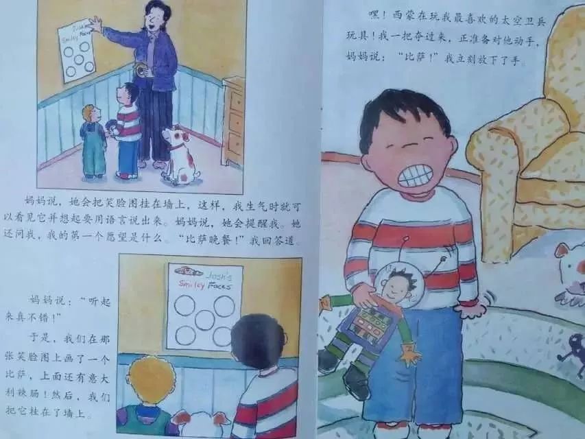 妈妈说,她会把笑脸图挂在墙上,这样,我生气时就可以看见它并想起要用语言说出来。妈妈说,她也会提醒我。她还问我,我的第一个愿望是什么。“比萨晚餐!”我回答道。