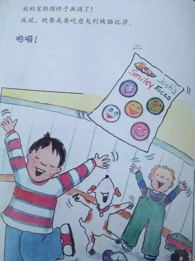 我的笑脸图终于画满了!我说:“晚餐我要吃意大利辣肠比萨。哟呵!”