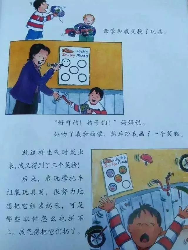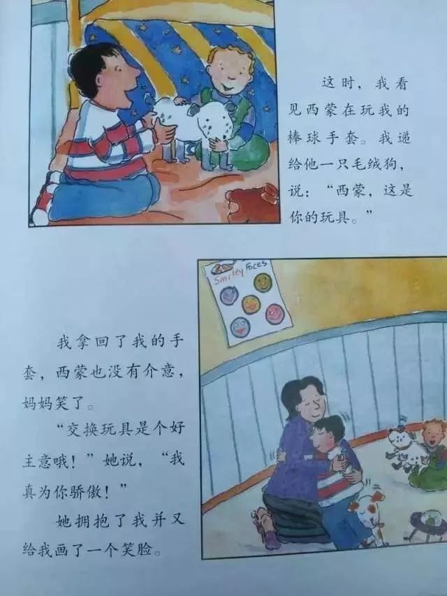 “交换玩具是个好主意哦!”她说,“我真为你骄傲!”她拥抱了我并又给我画了一个笑脸。