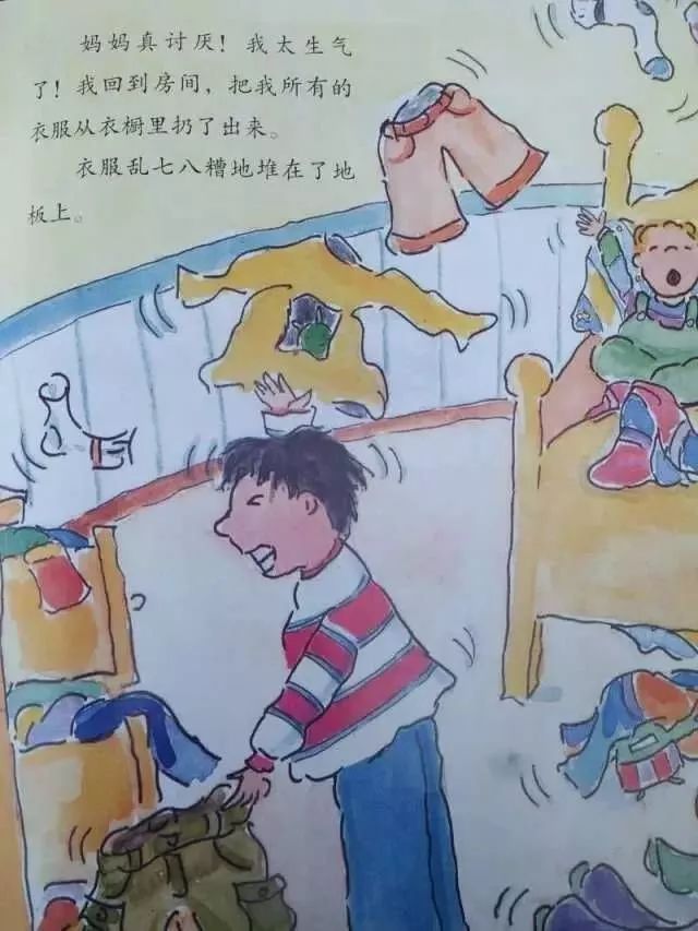 妈妈真讨厌!我太生气了!我回到房间,把所有的衣服从衣橱里扔了出来。