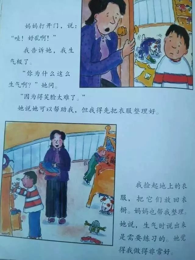 我捡起地上的衣服,把它们放回衣橱。妈妈也帮我整理。她说,生气时说出来是需要练习的。她觉得我做得非常好。