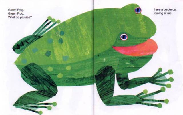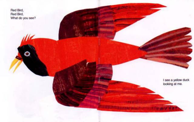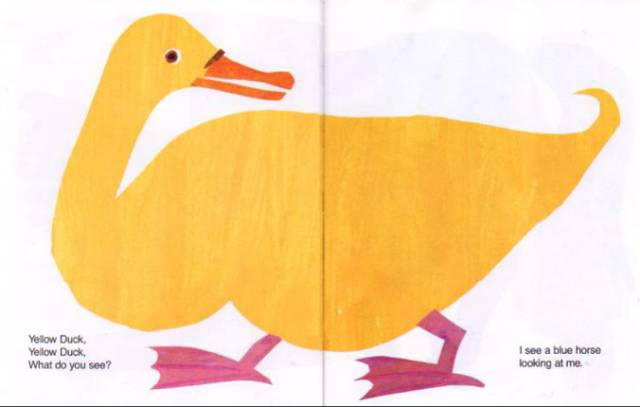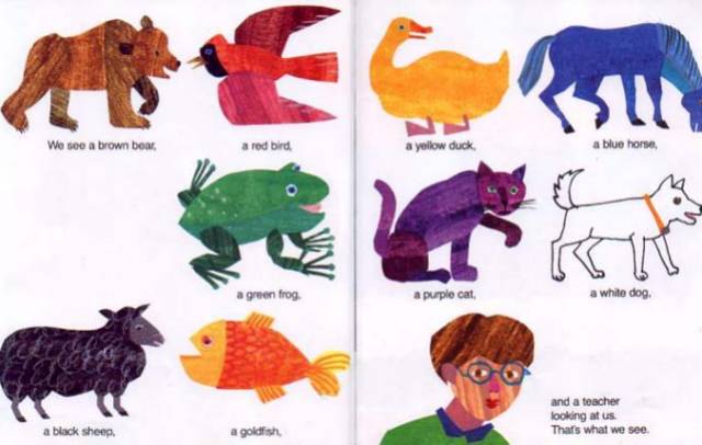 棕熊棕熊,你看到了什么?我看到了一只红色的鸟看着我。红色鸟,红色鸟,你看到了什么?我看到一只黄色的鸭看着我。黄色鸭子黄色鸭子,你看到了什么?我看到了……