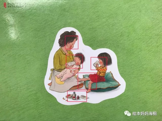 封底的美依和妹妹一起喝着牛奶,美依的膝盖上还多了两块创可贴,身旁的消毒水、镊子,刚刚美依的腿一定经过了妈妈的贴心护理吧!妹妹吃着牛奶,已经要睡着了,妈妈一手帮妹妹扶着奶瓶,眼睛关切的看着美依,美依的一只小脚搭在妈妈的腿上,好温馨的亲子时光。
