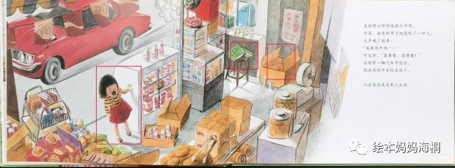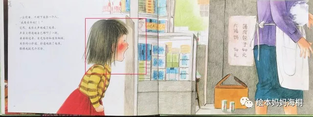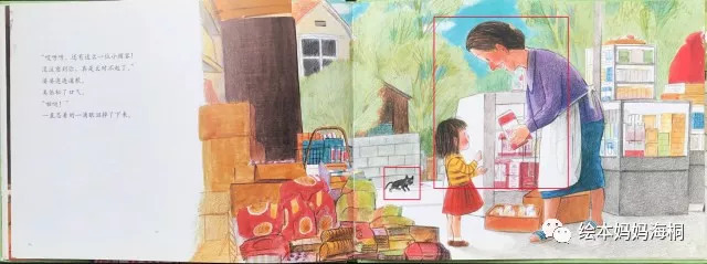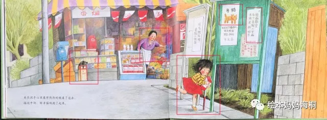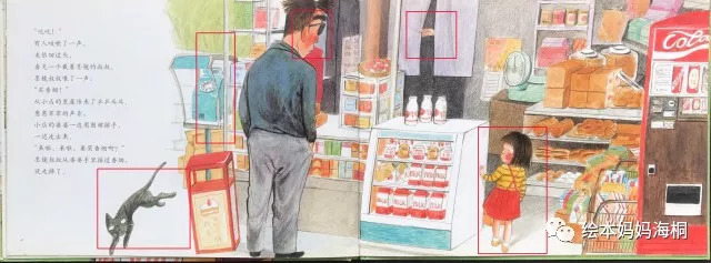 美依好紧张,她一只手扶住柜台边,眼睛往里张望,小店的主人呢?大家看,右边凳子上有一本书还没合上,旁边有一个打开的箱子,那么,店主是不是正在看书的时候来了货,去整理货物了呢?