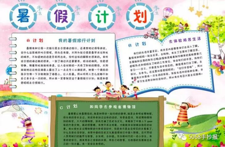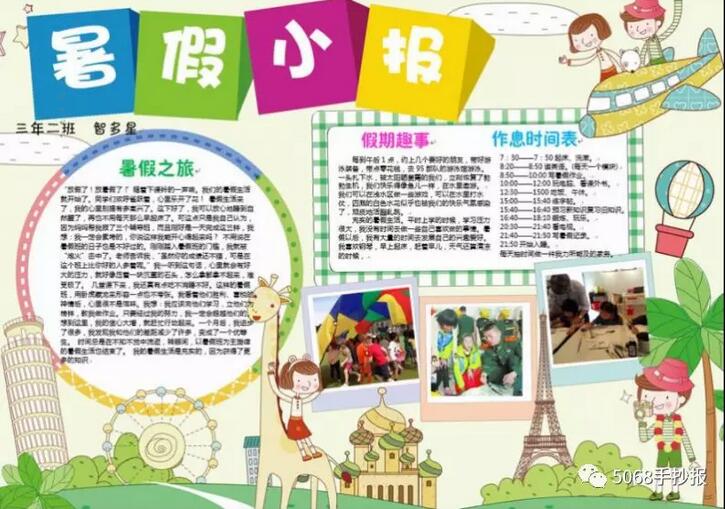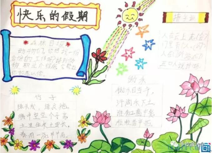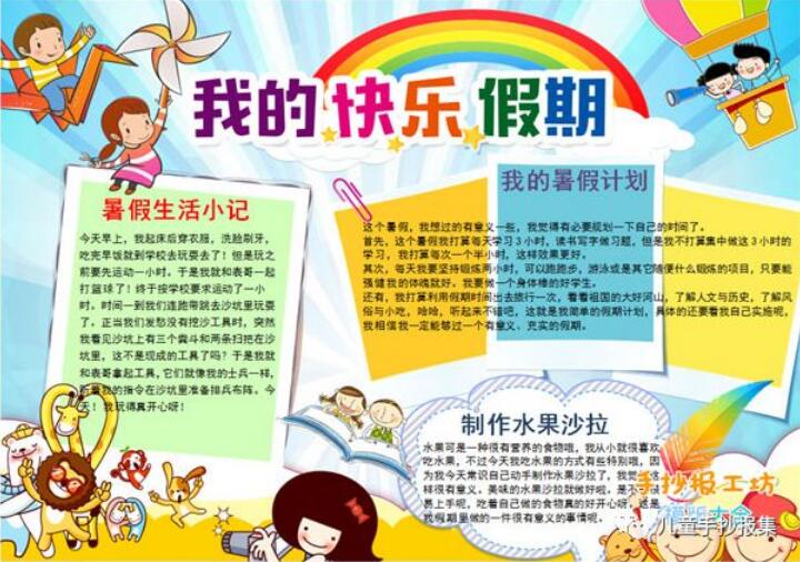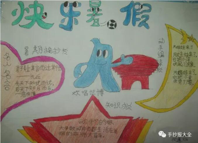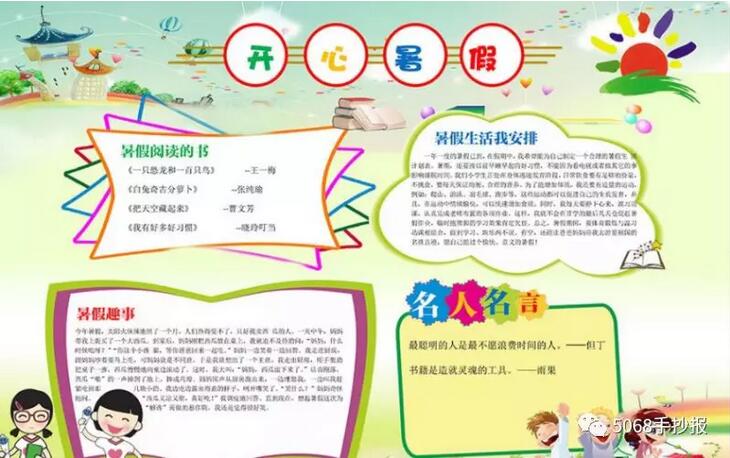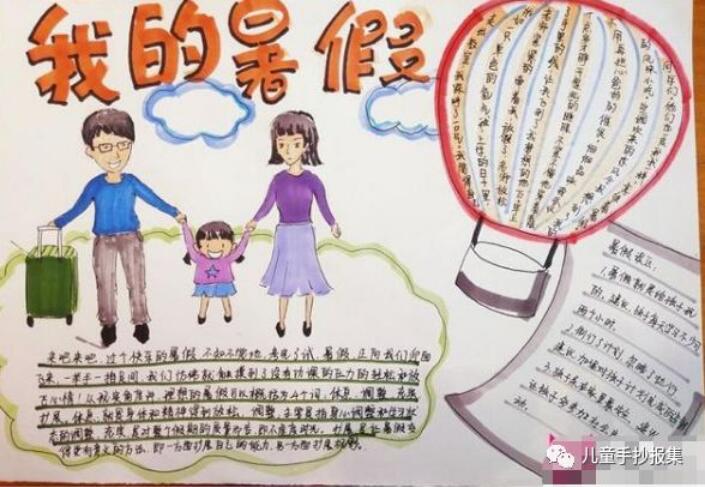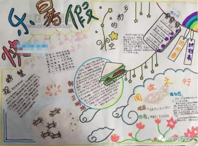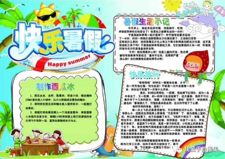 [手抄报]暑假生活手抄报 主要绘画工具 铅笔:2B或HB自动铅笔 水彩笔:12色或24色水彩笔 勾线笔:樱花记号笔、1.0针管笔、0.4针管笔 上色:60色或80色马克笔动漫套装 主要绘画元素 本款手抄报主要绘画