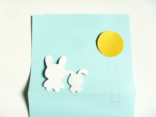 为了让贺卡更加精致,所以我们要确定好位置之后再继续下一步,将彩纸展开,把之前剪好的兔子和月亮放在贺卡上,确定好摆放的位置,并用铅笔标记定位。