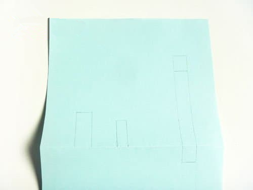 在彩纸上画好三个长条,这三个长条的作用非常关键,长条的位置要对应好刚刚标记好的位置,月亮的摆放位置比较高,所以长条也比较长,注意长条靠上的位置,要多划分出一小段,如图所示。