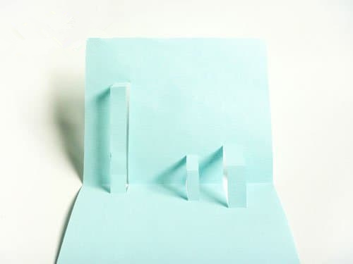 将已经划好的彩纸贴在卡纸上,就会有三条呈立体装的长条,如图所示。