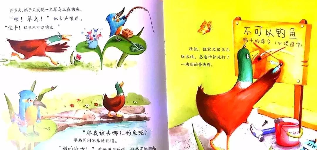 没多久,鸭子又发现一只翠鸟正在钓鱼。“喂!翠鸟!”他大声嚷道,“住手!这里不可以钓鱼。”