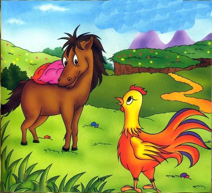 大公鸡来到小溪边,听到对岸有蛐蛐的叫声。大公鸡特别喜欢吃蛐蛐,恨不得一下子飞过去,饱餐一顿,可是他不会游泳,怎么办呢?这时小马从后面跟上来,见大公鸡在发愁,就跑过去问:“大公鸡,你怎么了,需要我帮忙吗?”而大公鸡像没听见一样,理都不理,一个人下了河。小马急的直说:“大公鸡,你别下河,那样会淹死你的!”可是已经来不及了,大公鸡拍打着翅膀奋力向河对面游去。快到河中央,他的翅膀已全被打湿,劲儿也没了,眼看整个身子都要被大水吞没了。他大声叫着:“救命呀!救命!”此时的小马已奋不顾身地下了河,大公鸡得救了。