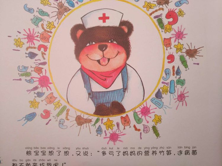 熊宝宝想了想,又说:“多亏了妈妈的营养竹笋,连病菌都不敢来找我呢!”