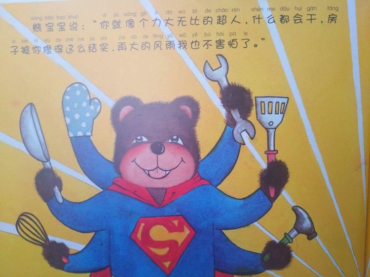 熊宝宝说:“你就像个力大无比的超人,什么都会干,房子被你修的这么结实,再大的风雨我也不害怕了。”