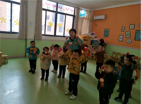 5、孩子拿着玩具小猫、小狗在路上跳舞、游戏。