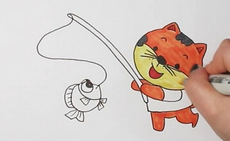 4、最后将小猫衣服涂成蓝色,鱼竿和鱼分别涂成棕色和粉色,一只钓鱼的小猫就画好了。