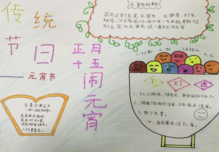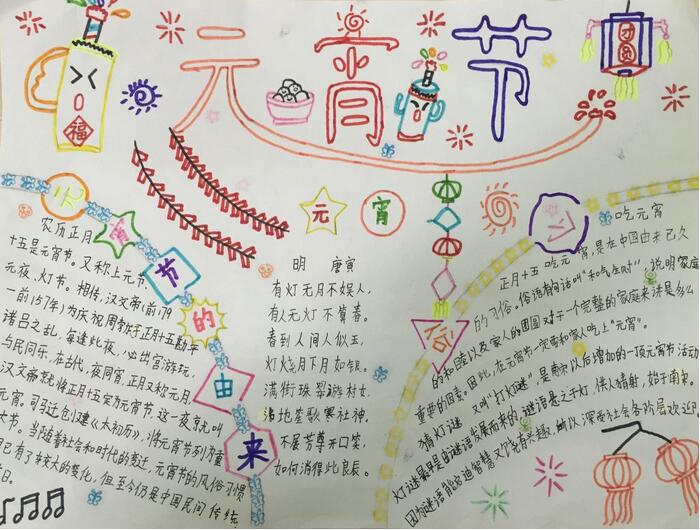 [手抄报]元宵节,又称上元节、灯节,是我国最重要的传统节日之一。古人称夜为宵,正月十五是一年中第一个月圆之夜,所以称正月十五为元宵节。下面小编整理《元宵节手抄报》为主题的手抄报供