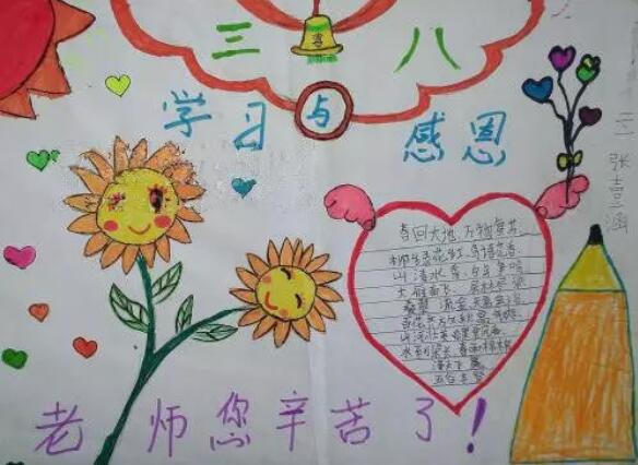 [手抄报]首先在右上角的位置写上粉红色的3.8妇女节主题报头,左边画一个给妈妈送礼物的小女孩,底部画一片向日葵花,加上两个文字框,背景涂成浅粉色,给小女孩和妈妈涂上颜色,向日葵涂成橘