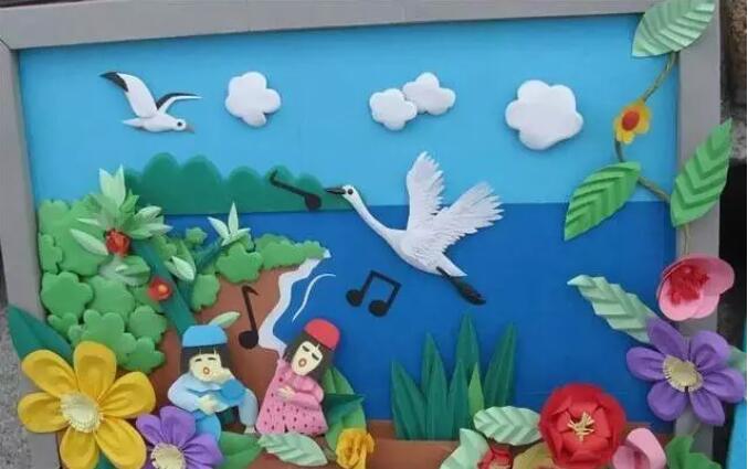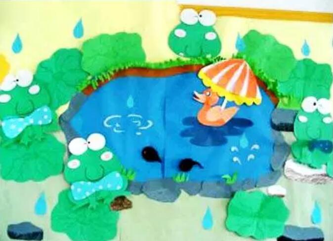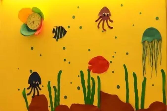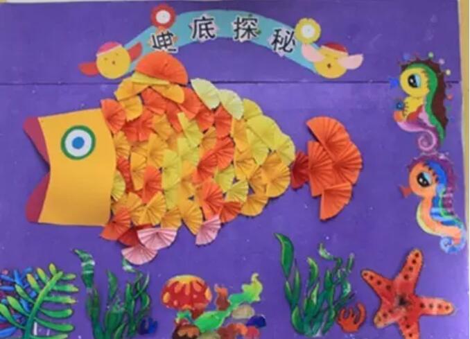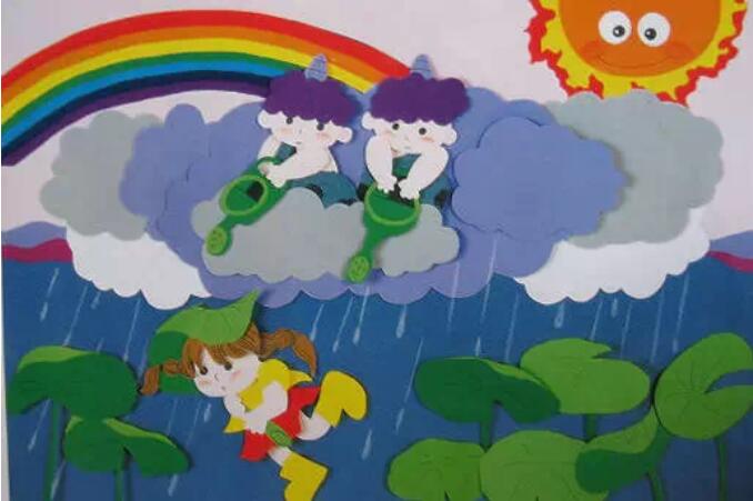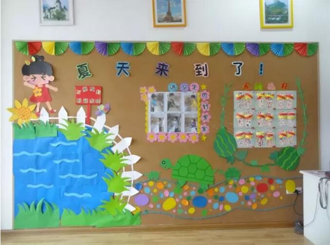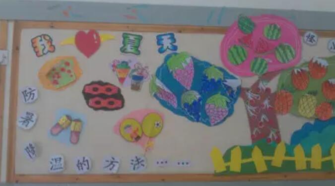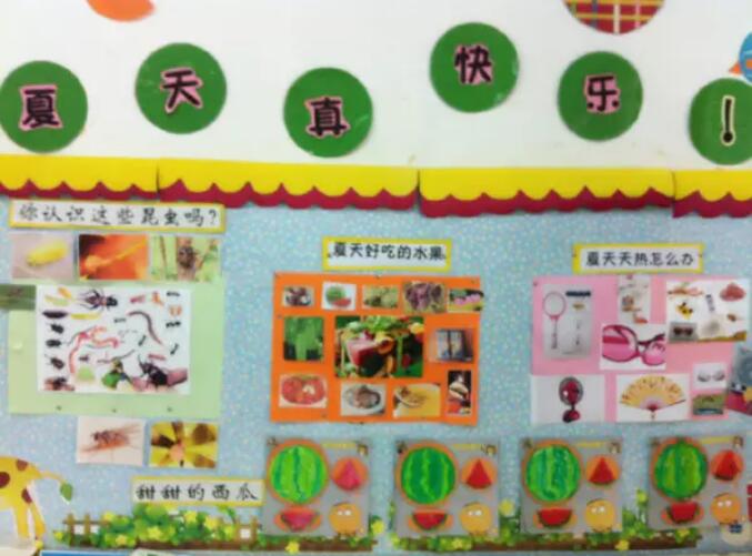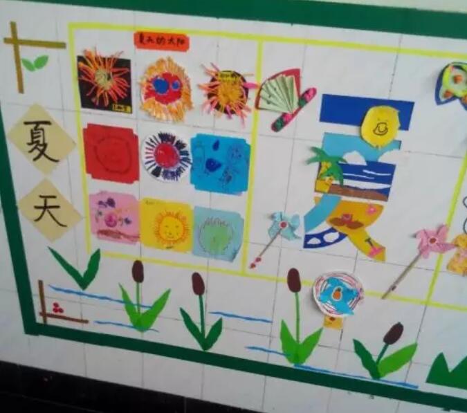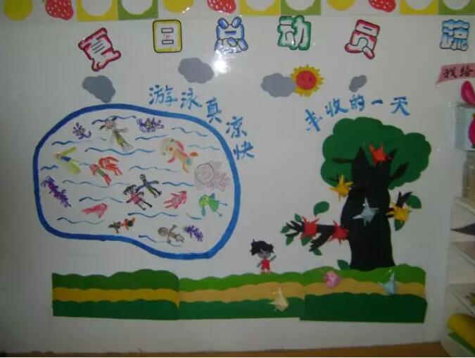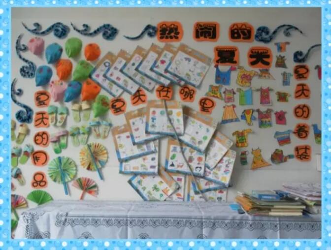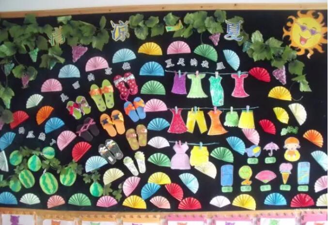 把幼儿自己动手的折纸作品以扇形的方式有序地呈现出清凉一夏的主题墙,既能把幼儿作品融入到环创中,也大大节省了教师的布置功夫,确实是个不错的主意!你说呢?