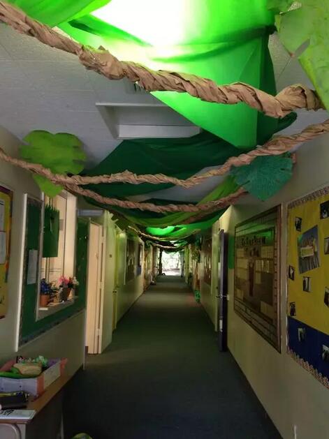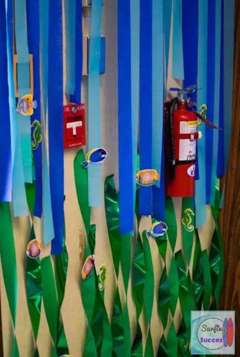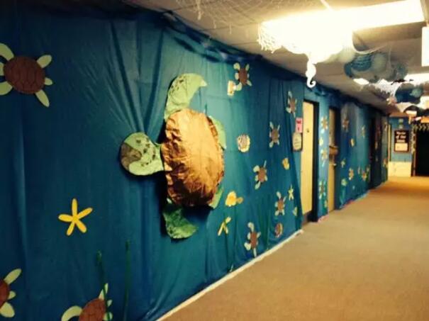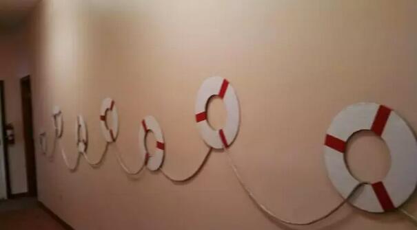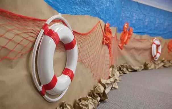 牛皮纸最接近沙滩的颜色,用它来打底,上面挂上救生圈和网,走廊就是沙滩海景咯。