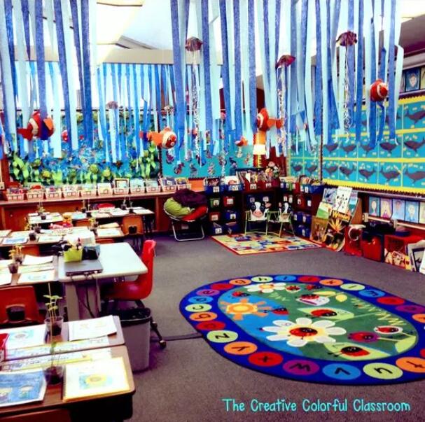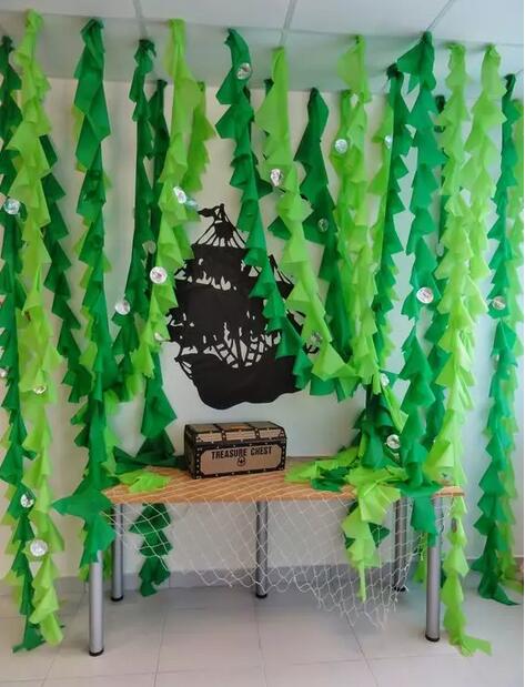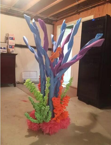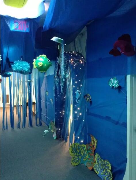 如果你觉得上面过于杂乱和阴暗,可以减少装饰数量,在顶部用网兜一些蓝白色的气球,打造海底氛围。