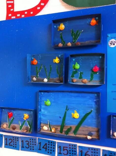 背景刷成蓝色,孩子们的绘画作品可以放在鞋盒盖里展示