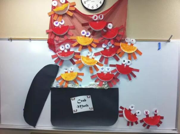 对于像螃蟹等小动物,可以设计一个打开的盒子,将作品布置在周围,营造小螃蟹倾巢而出的感觉。