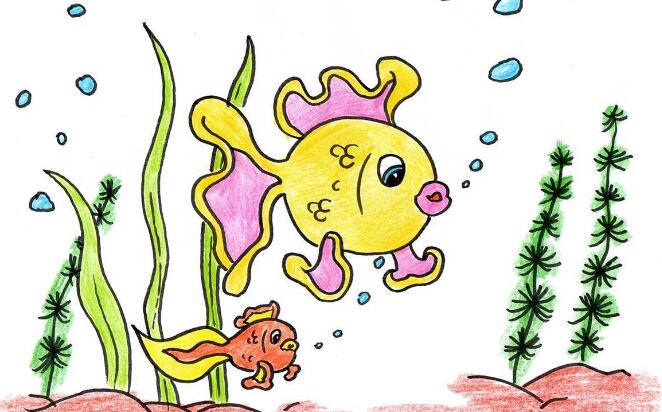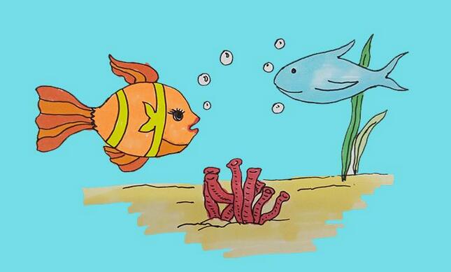 [简笔画大全]首先画第一条小鱼。画出它的身体。完善细节,再画出第二条小鱼。注意线条要流畅,周围可以多画些泡泡。再画上水草,石头等。最后涂自己喜欢的颜色,海底世界两只小鱼儿童简笔画图片