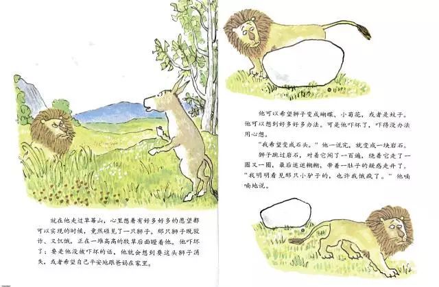 狮子跳过岩石,对着它闻了一百遍,绕着它走了一圈又一圈,最后迷迷糊糊,带着一肚子的疑惑走开了。“我明明看见那只小驴子的,也许是我饿疯了。”他喃喃地说。