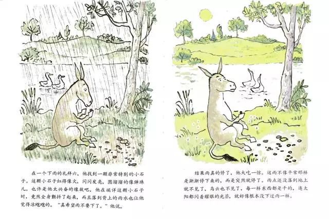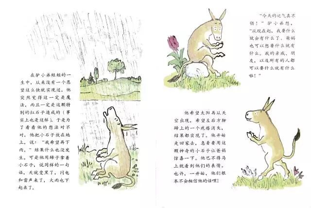 ➤在驴小弟短短的一生中,从来没有一个愿望这么快就实现过。他突然觉得这一定是魔法,而且一定是这颗特别的红石子造成的(事实上也是这样)于是为了看看他的想法对不对,他把小石子放在地上,说:“我希望再下雨。”结果什么也没发生。可是他用蹄子拿着小石子,说同样的一句话时,天就变黑了,闪电和雷声来了,大雨也下起来了。