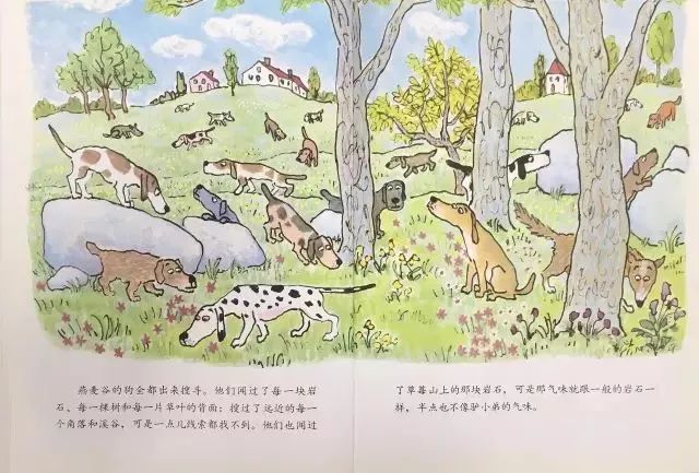 ➤ 燕麦谷的狗全都出来搜寻。他们闻过了每一块岩石、每一棵树和每一片草叶的背面;搜过了远近的每一个角落和溪谷,可是一点儿线索都找不到。他们也闻过了草莓山上的那块岩石,可是那气味就跟一般的岩石一样,半点也不像驴小弟的气味。
