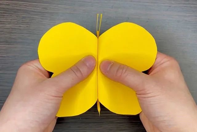 5、这是折叠之后的蝴蝶,大家可以看到蝴蝶的身体部分是向下凹陷的。现在用着色笔画上蝴蝶翅膀的花纹。