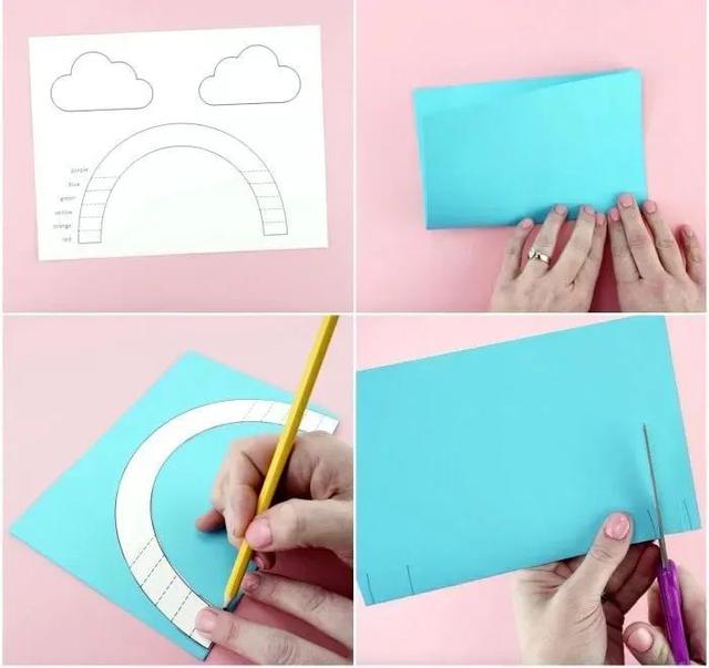 3、将彩虹色条叠放粘合在一起,然后粘在卡纸上的两个小豁口上,再剪出两朵白云粘上去。