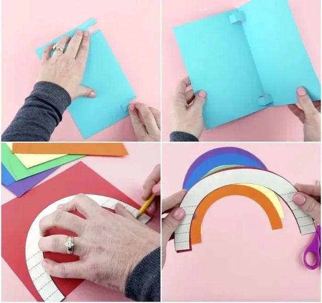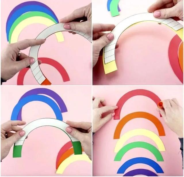 2、用不同颜色的卡纸,分别剪出不同大小的彩虹色条。
