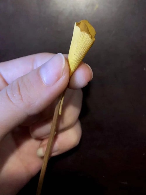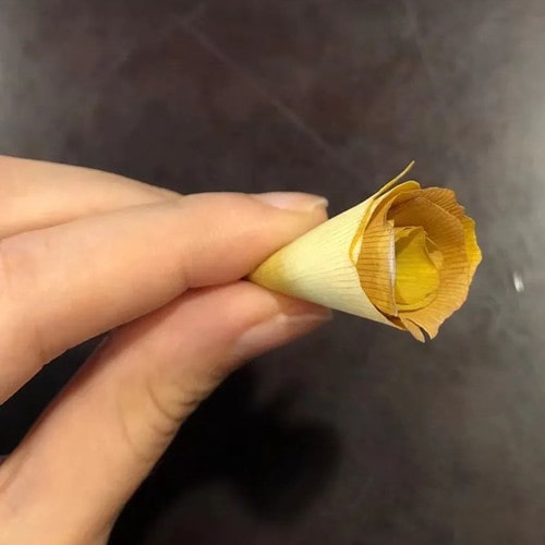 3、选择比第一片稍大的叶子卷在外层,包裹住内层的第一片叶子。用手捏住银杏叶的末端,并依次选择比里层稍大的银杏叶层层包裹在外。