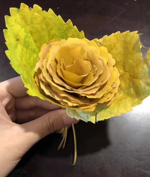 4、选择两片绿色的落叶包裹在银杏花朵的最外层作为装饰点缀,最后用透明胶带缠住尾端,一朵银杏叶仿玫瑰花朵就做好啦!