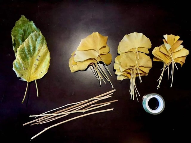 准备材料:银杏叶、绿色落叶、透明胶带、树枝