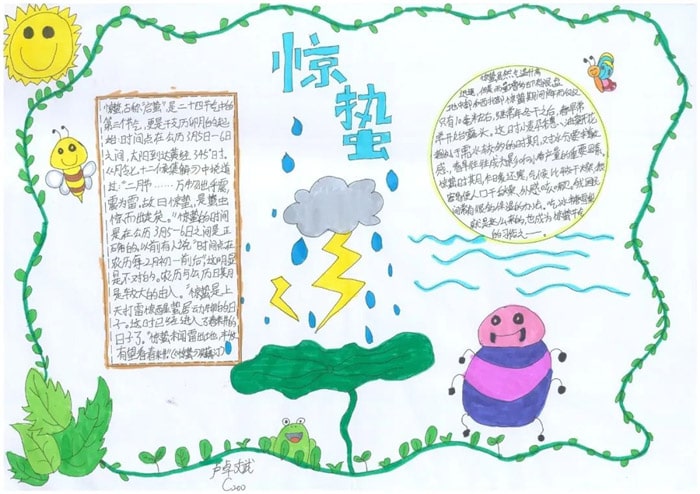 每年3月5日或6日,太阳到达黄经345度时为“惊蛰”。惊蛰的意思是天气回暖,春雷始鸣,惊醒蛰伏于地下冬眠的昆虫。《月令七十二候集解》中说:“二月节,万物出乎震,震为雷,故曰惊蛰。是蛰虫惊而出走矣。”实际上,昆虫是听不到雷声的,大地回春,天气变暖才是使它们结束冬眠,“惊而出走”的原因。下面小编整理《24节气惊蛰手抄报》为主题的手抄报供大家参考学习。